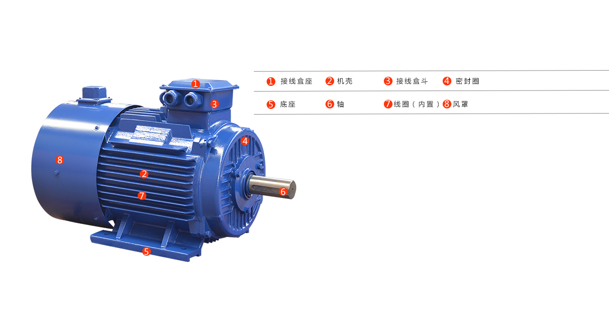 采用垂直水平的平行散熱片結構,接線盒在機座頂部,接線盒的進線方式為橡套電纜,其接線端子分為三個(供一種電壓)或六個(供兩種電壓)兩種結構。