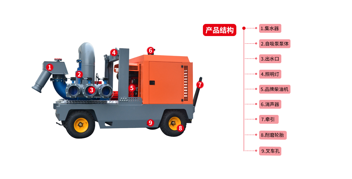 應急移動防汛泵車,是我公司根據多年的搶險經驗和廣大用戶的建議,經過多次技術改進后推出的最新產品,具有整車質量輕、抽水流量大、揚程高、越野性能好、機動性能好、牽引裝卸快捷、操作使用簡單、環境適應能力強等等特點,是現階段防汛抗旱的主力軍。防汛排澇移動泵車采用高端中外合資高品質柴油機發動機,通過船用高彈聯軸器直接驅動雙吸自吸式離心泵。配置最高時速可達50公里/時的高速全掛式牽引拖車,可輕松通過碎石路面,水泥路面,泥濘路面等惡劣環境。配用1變3分水頭,將大口徑的進出水管變成小口徑,并選用高強度輕質塑筋軟管,配備不銹鋼快速拆卸接頭,可降低操作人員數量及勞動強度,2-3人就可輕松操作。配備油潤滑式旋片式真空泵直接抽取泵內和進水管路內的空氣,泵內不需要再灌引水。