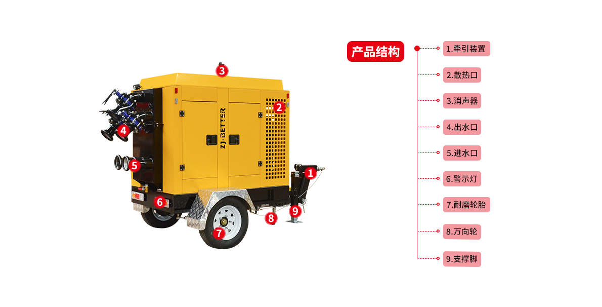 靈活性:拖車式移動排澇泵車移動方便,可以在多種環境下工作。它可以通過牽引車頭或掛車進行運輸,適應各種道路和地形。